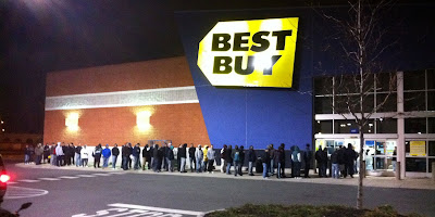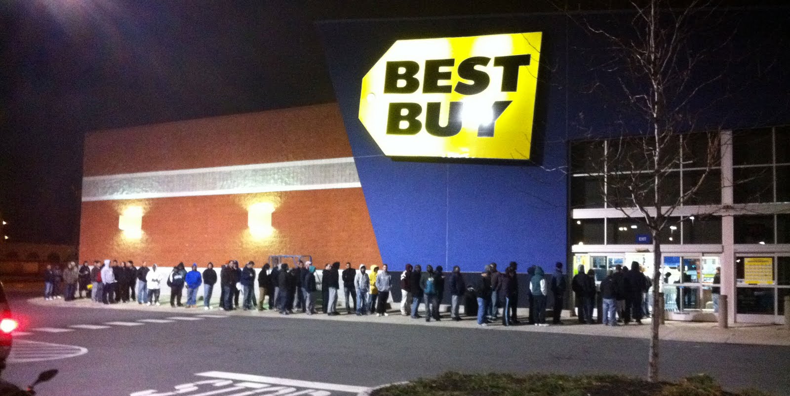 Fila de pessoas enfrentando o frio da madrugada em frente à loja Best Buy,