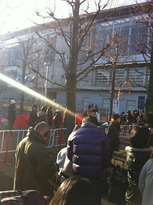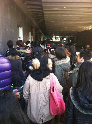 Fila de pessoas aguardando liberação da entrada.