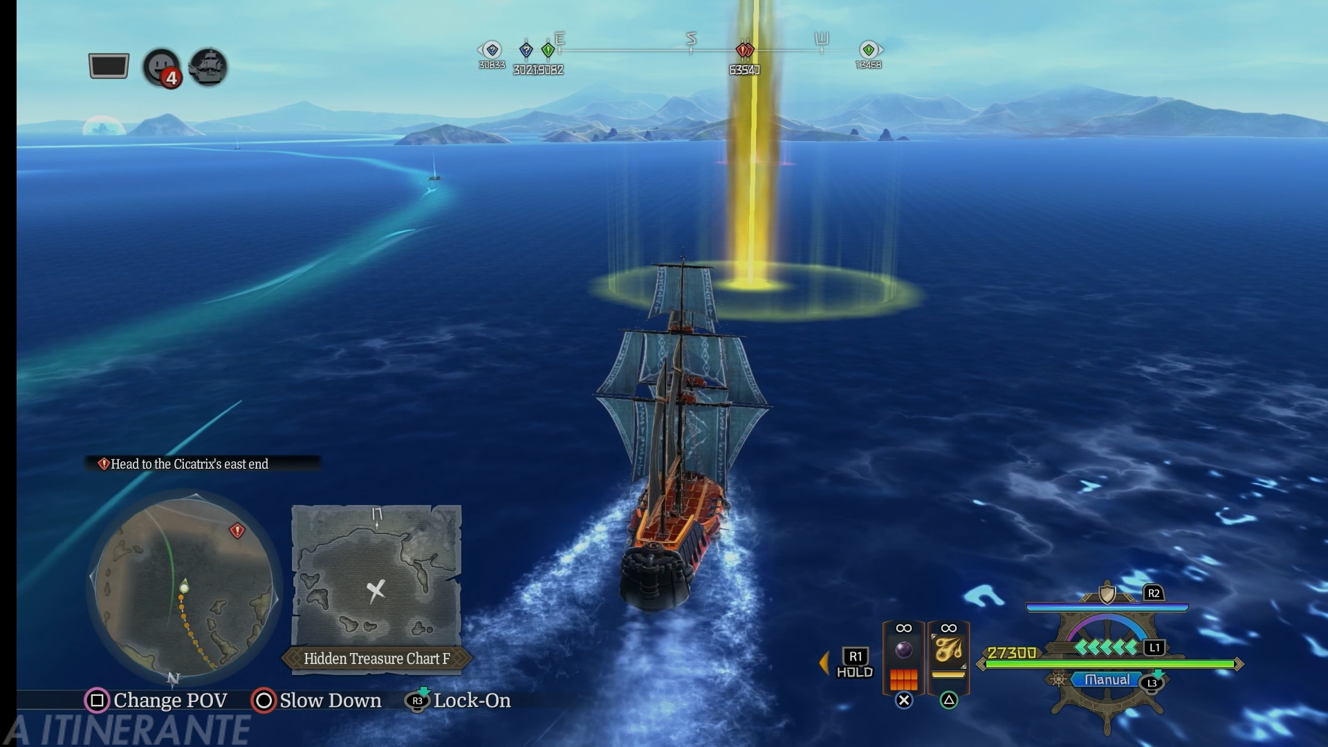 E ainda no mar, sempre que você ver aquelas marcas douradas, vale a pena ir até elas. Ao vencer a batalha que acontece ali, você libera correntes marítimas que aumentam significativamente a velocidade do seu navio.