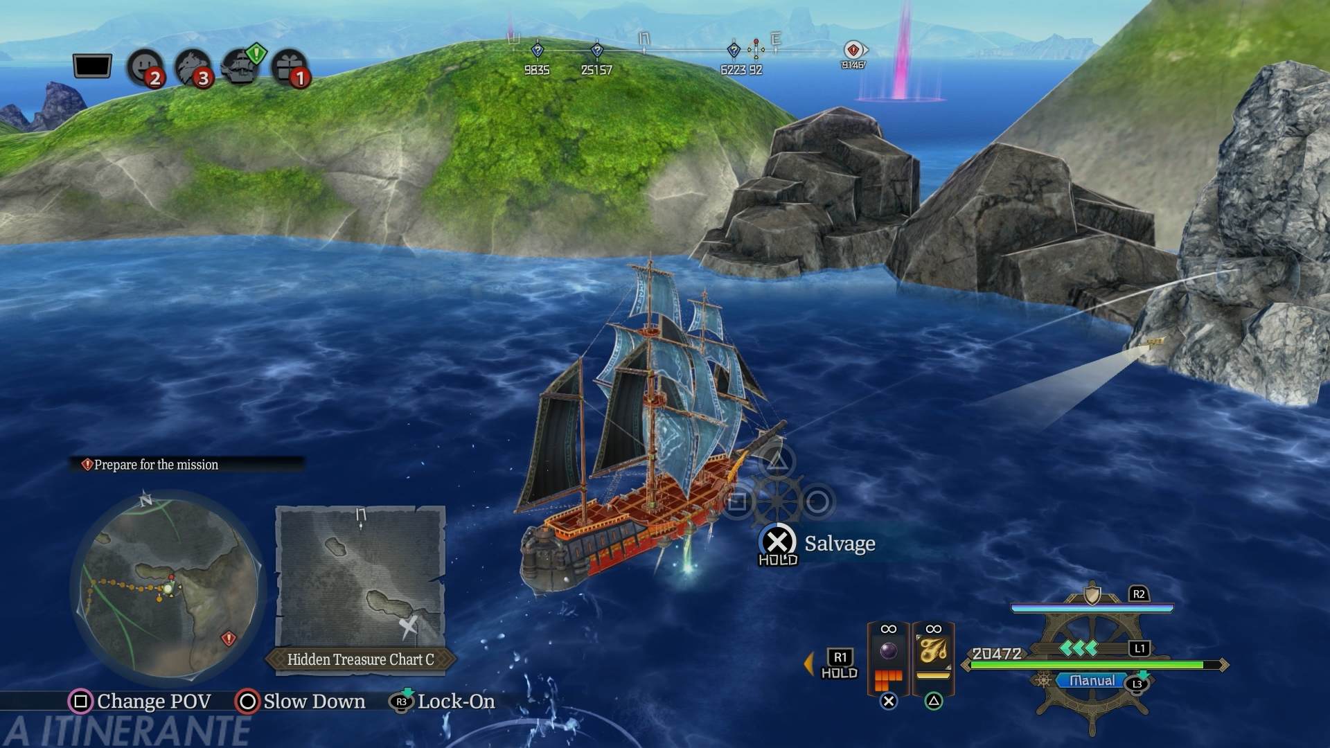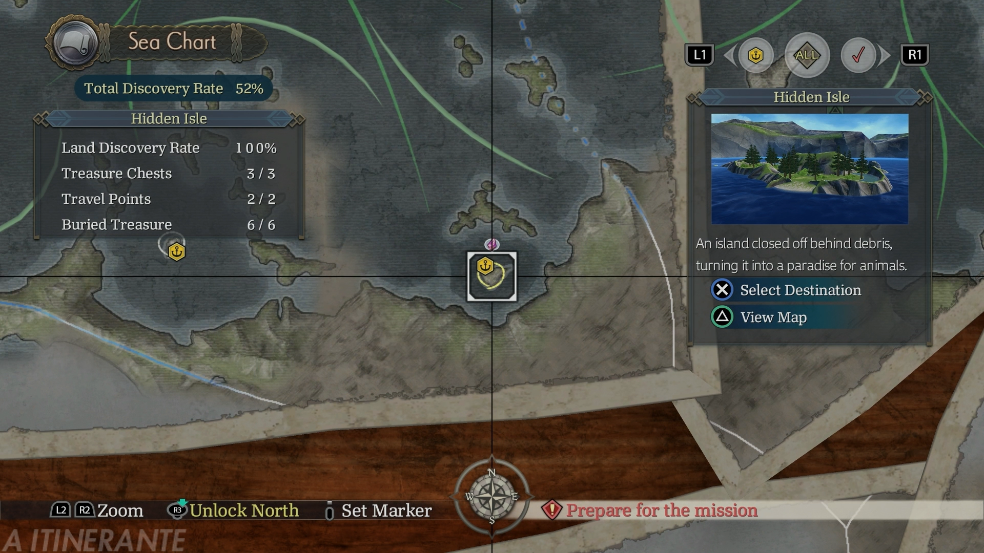 Outra coisa importante são os mapas de tesouro. Eles não marcam automaticamente o local, então você precisa comparar o mapa com o cenário enquanto navega.