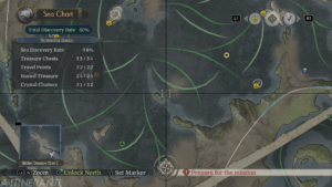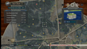 Só que tem um detalhe muito importante aqui: se você ativar a Mana Vision e abrir o mapa da área ao mesmo tempo, o jogo revela todos os baús enterrados e cristais quebráveis daquele mapa. Isso facilita demais pra quem quer explorar tudo sem ficar rodando perdido.