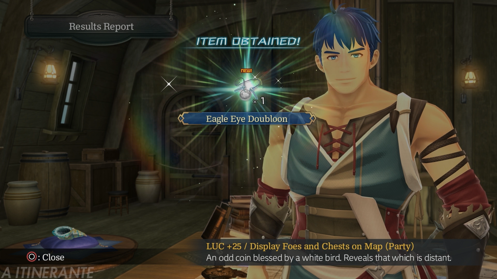 Por fim, conforme você avança na exploração e reporta seu progresso ao Dogi, você recebe recompensas importantes. Uma delas é o Eagle Eye Doubloon, um acessório extremamente útil que revela baús e monstros no mapa, facilitando muito a exploração completa.
