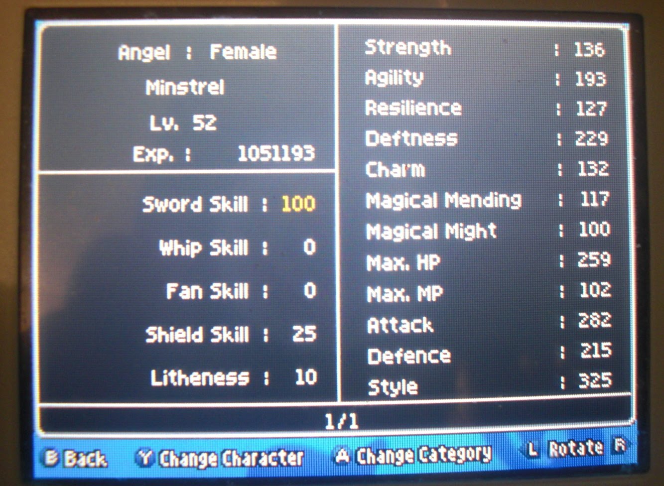 Antes de enfrentar o Corvus eu tinha feito a Inferno Blade (ataque 99), mas logo em seguida ganhei e comecei a usar a Miracle Sword (atq 77) que recupera HP à cada ataque e em seguida peguei a Rusty Sword e fiz uma Erdrick Sword com ataque 158. O Belo, coitado, tem um Archdemon Whip com ataque 86 mas ainda está cursado e teve que se virar com o Gigaspike Whip com atq 68. O Elliot se deu bem. Eu tinha feito o Mega Magical Mace, com ataque 65 e 9% de absorção de MP, mas logo em seguida encontrei o Sceptre of Gift com ataque de 70 e 7,5% de aborção.